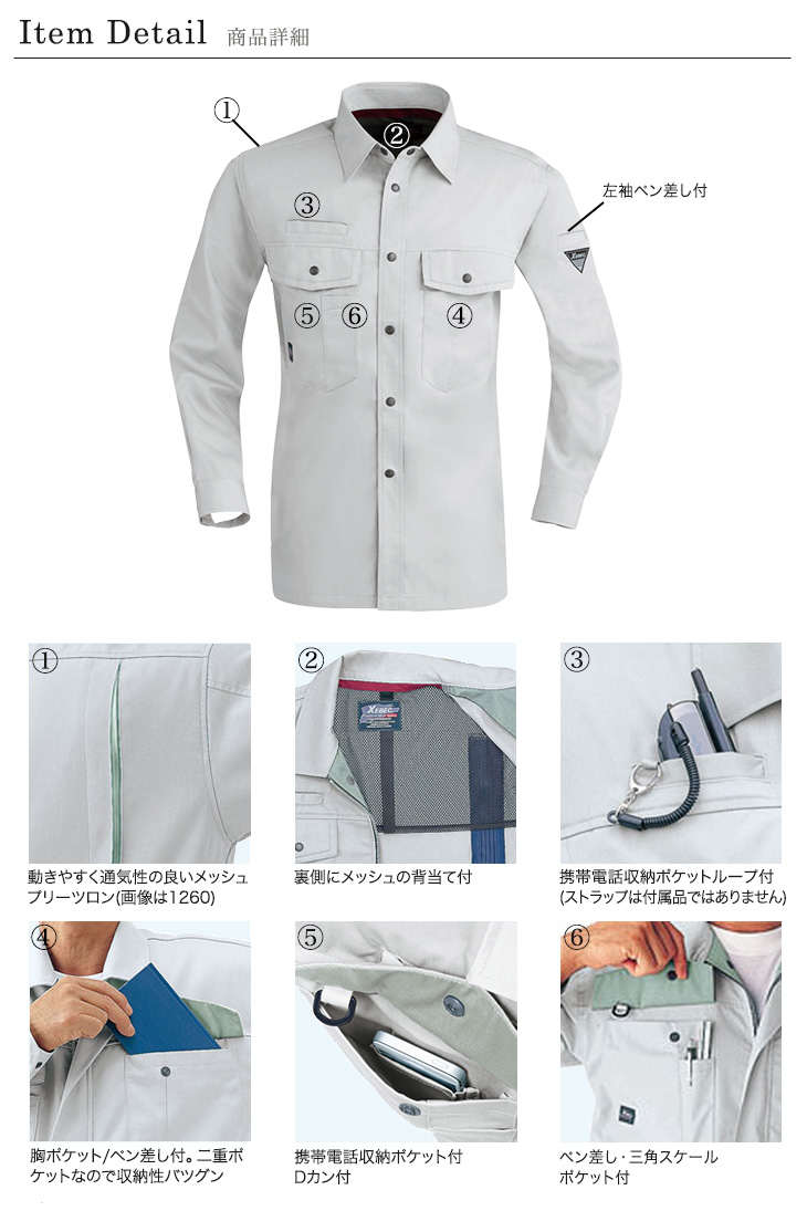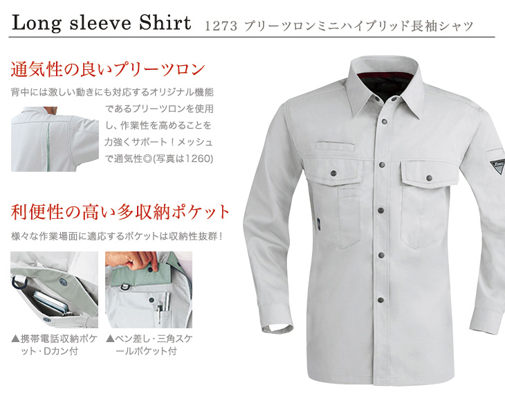 1260,長袖シャツ,ジーベック,春夏用,1270シリーズ,プリーツロンMINIハイブリッド,帯電防止,ソフト風合い,防縮、防シワ,年間対応,メッシュプリーツロン,グレー,チャコールグレー,モスグリーン,建設,建築,電機,設備,営業,配達