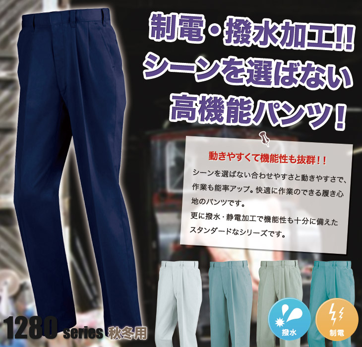 作早2015AW,スラックス,パンツ,ジーベック,秋冬用,1280シリーズ,プリーツロンMINI,帯電防止,撥水加工,コン,ネービー,グレー,グリーン,モスグリーン,ミントグリーン,建設,建築,電気,設備,農業,運送,倉庫,