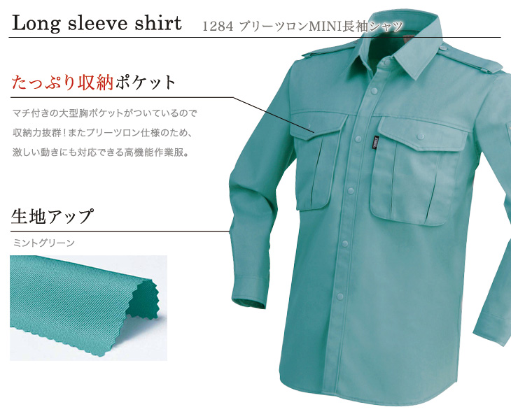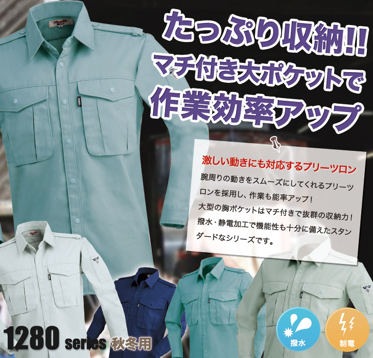 作早2015AW,長袖シャツ,ジーベック,秋冬用,1280シリーズ,プリーツロンMINI,帯電防止,撥水加工,コン,ネービー,グレー,グリーン,モスグリーン,ミントグリーン,建設,建築,電気,設備,農業,運送,倉庫,