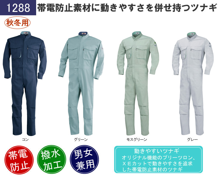 ,つなぎ服,秋冬用,帯電防止,楽脱ファスナー,XEカット,プリーツロン,スムーズアップ,撥水,男女兼用,コン,ネービー,グレー,グリーン,モスグリーン,電気,設備,運送,倉庫