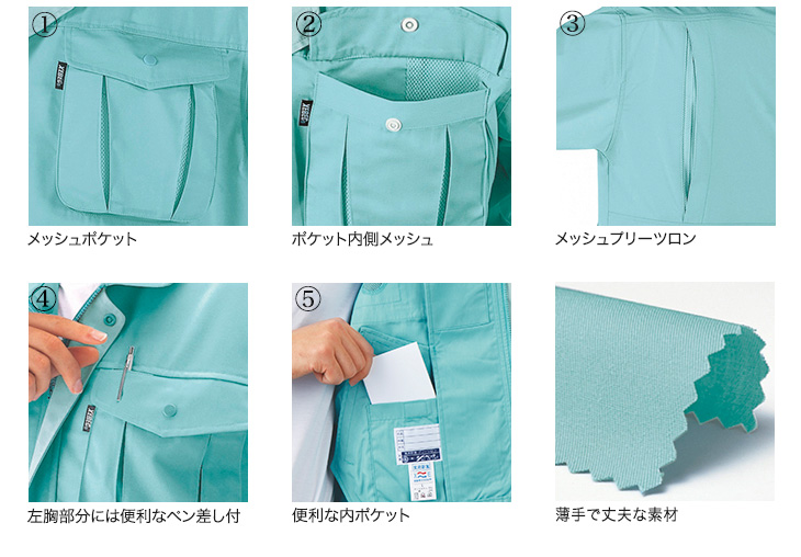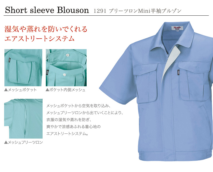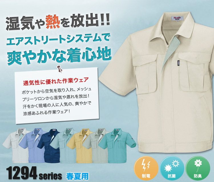 半袖ブルゾン,ジーベック,春夏用,クールビズ,1290シリーズ,プリーツロンMINI,帯電防止,抗菌防臭,エアストリート,メッシュ,コン,グレー,アイボリー,ブルー,マスタード,グリーン,モスグリーン,ミントグリーン,5L,建設,建築,運送,倉庫,電機,設備,大工