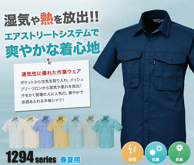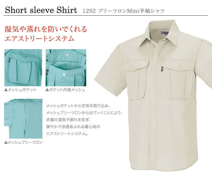 半袖シャツ,ジーベック,春夏用,クールビズ,1290シリーズ,プリーツロンMINI,帯電防止,抗菌防臭,エアストリート,メッシュ,コン,グレー,アイボリー,ブルー,マスタード,グリーン,モスグリーン,ミントグリーン,5L,建設,建築,運送,倉庫,電機,設備,大工