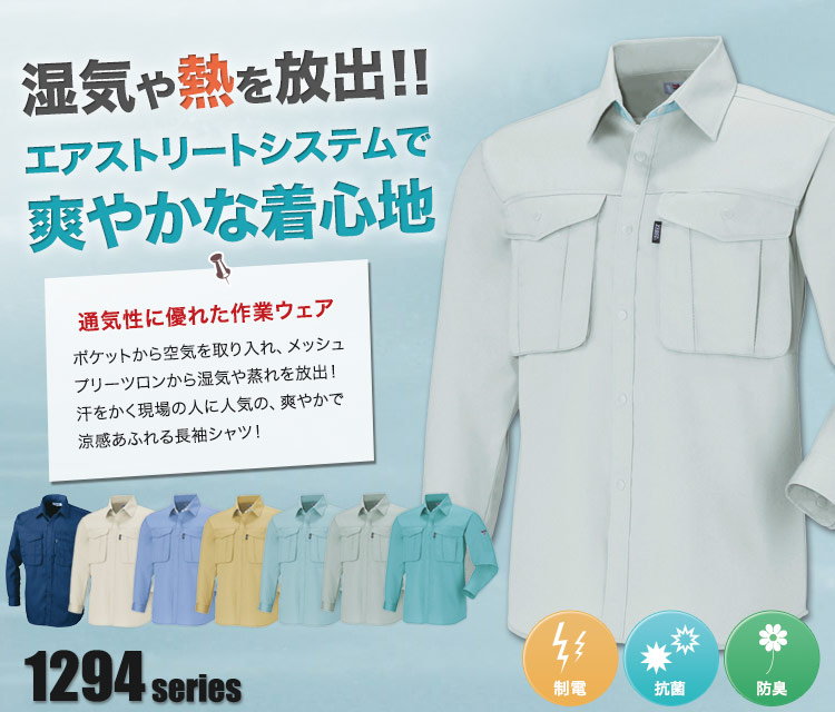 作早2015AW,長袖シャツ,・Wーベック,春夏用,クールビズ,1290シリーズ,プリーツロンMINI,帯電防止,抗菌防臭,エアストリート,メッシュ,コン,グレー,アイボリー,ブルー,マスタード,グリーン,モスグリーン,ミントグリーン,5L,建設,建築,運送,倉庫,電機,設備,大工