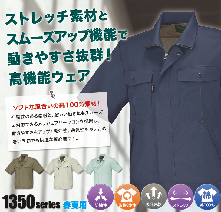 半袖ブルゾン,ジーベック,春夏用,1350シリーズ,ラファード,プリーツロン,通気性,吸汗性,スムーズアップ,伸縮素材,ソフト風合い,防縮防シワ,形態安定,速乾性,コン,グリーン,モスグリーン,アーミーグリーン,5L,建設,建築,鉄鋼,鉄工所,溶接,綿100%,農業