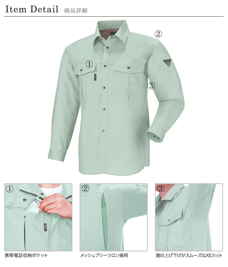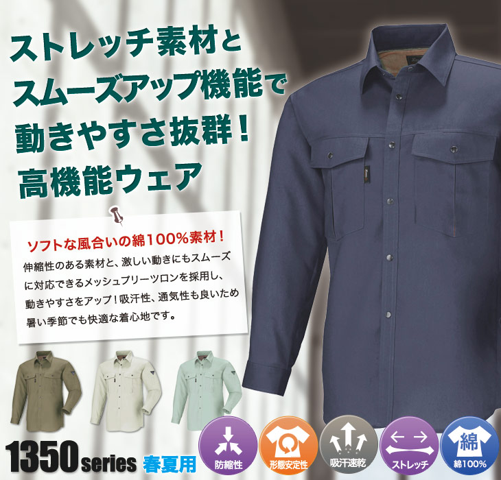 長袖シャツ,ジーベック,春夏用,1350シリーズ,ラファード,プリーツロン,通気性,吸汗性,スムーズアップ,伸縮素材,ソフト風合い,防縮防シワ,形態安定,速乾性,コン,グリーン,モスグリーン,アーミーグリーン,5L,鉄鋼,鉄工所,溶接,綿100%,建設,建築,農業