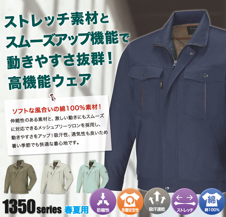長袖ブルゾン,ジーベック,春夏用,1350シリーズ,ラファード,プリーツロン,通気性,吸汗性,スムーズアップ,伸縮素材,ソフト風合い,防縮防シワ,形態安定,速乾性,コン,グリーン,モスグリーン,アーミーグリーン,5L,鉄鋼,鉄工所,溶接,綿100%,建設,建築,農業
