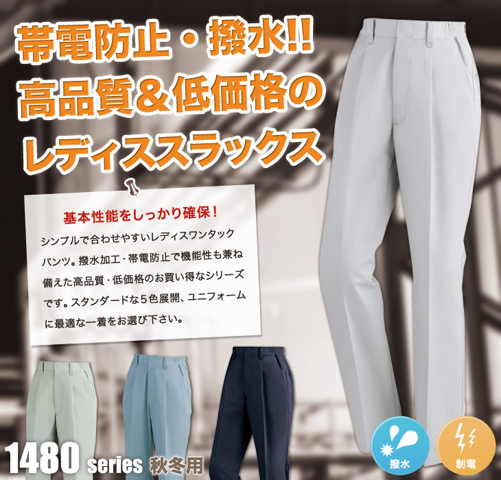 作早2015AW,スラックス,パンツ,ジーベック,秋冬用,1480シリーズ,ジーベックQUALITY,レディース,女性用,帯電防止,撥水加工,男女兼用,建設,土木,電気,設備,農業,運送,倉庫,