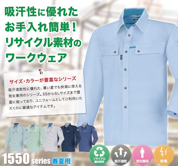 1550,大きい,長袖シャツ,ジーベック,春夏用,1550シリーズ,CRESTA21,クレスタ21,コン,ディープネイビー,シルバーグレー,サックス,ターコイズブルー,マスタード,モスグリーン,チェリーレッド,ミストグリーン,リサイクル,帯電防止,吸汗,速乾,男女兼用,ペアユニフォーム,ポリエステル高混,メッシュ,SS,5L,6L,ビルメンテナンス,清掃,建設,建築,営業,配達,運送,倉庫,大工