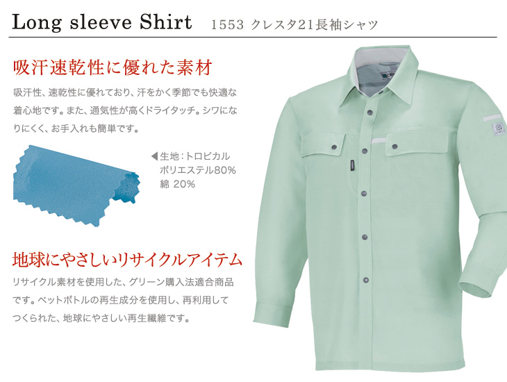 1550,大きい,長袖シャツ,ジーベック,春夏用,1550シリーズ,CRESTA21,クレスタ21,コン,ディープネイビー,シルバーグレー,サックス,ターコイズブルー,マスタード,モスグリーン,チェリーレッド,ミストグリーン,リサイクル,帯電防止,吸汗,速乾,男女兼用,ペアユニフォーム,ポリエステル高混,メッシュ,SS,5L,6L,ビルメンテナンス,清掃,建設,建築,営業,配達,運送,倉庫,大工