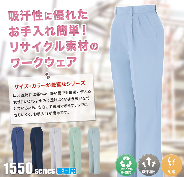 スラックス,1550,大きい,パンツ,ジーベック,春夏用,1550シリーズ,クレスタ21,CRESTA21,レディース,女性用,コン,ディープネイビー,シルバーグレー,サックス,ターコイズブルー,マスタード,モスグリーン,チェリーレッド,ミストグリーン,リサイクル,帯電防止,吸汗,速乾,男女兼用,ペアユニフォーム,ポリエステル高混,メッシュ,脇ゴム,5L,6L,ビルメンテナンス,清掃,建設,建築,営業,配達,運送,倉庫,女性用