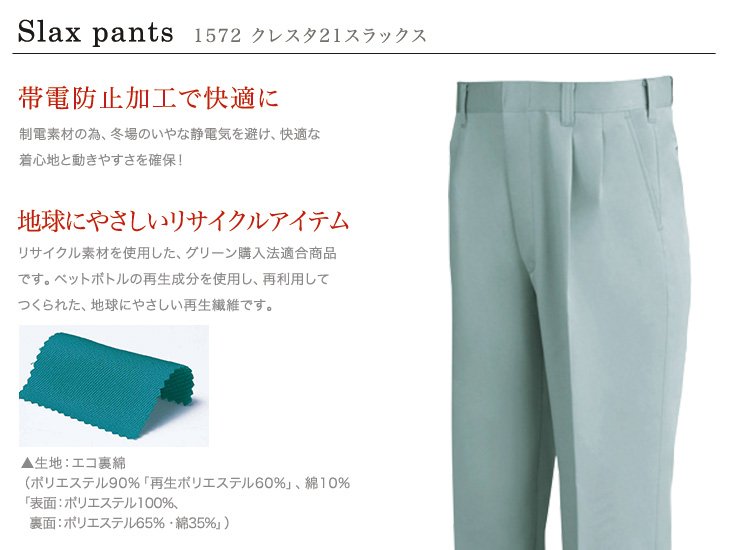スラックス,1570,大きい,パンツ,CRESTA21,クレスタ21,コン,ネービー,ディープネイビー,シルバーグレー,コバルトブルー,クロ,アラスカグリーン,ミストグリーン,XE,秋冬,製品制電,帯電防止,エコ,営業,リサイクル素材使用,裏綿素材,配達,イベント,建設,運送,清掃