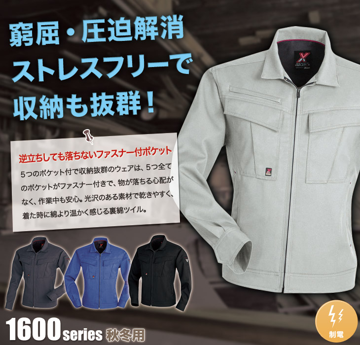 ジーベック,秋冬,長袖ブルゾン,帯電防止,裏綿,プリーツロン,スムーズアップ,クロ,ブラック,ブルー,チャコールグレー,シルバーグレー,運送,倉庫,営業,電機,設備,1600シリーズ