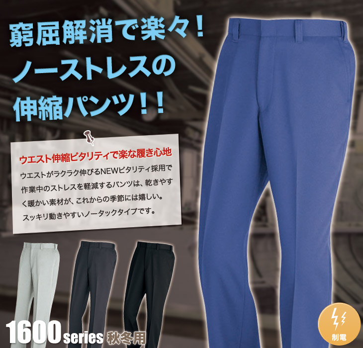 ジーベック,秋冬,パンツ,スラックス,帯電防止,裏綿,クロ,ブラック,ブルー,チャコールグレー,シルバーグレー,運送,倉庫,営業,電機,設備,1600シリーズ,