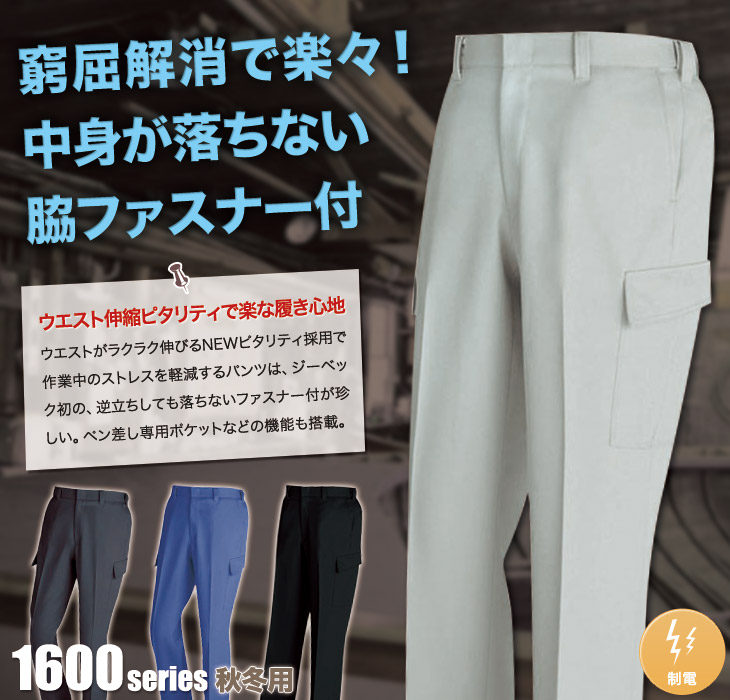 ジーベック,秋冬,パンツ,カーゴパンツ,帯電防止,裏綿,クロ,ブラック,ブルー,チャコールグレー,シルバーグレー,運送,倉庫,営業,電機,設備,1600シリーズ,