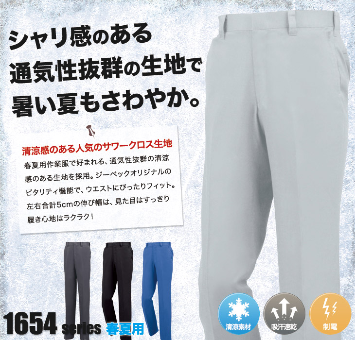 1654シリーズ,ジーベック,春夏用,スラックス,パンツ,ズボン,清涼,帯電防止,制電,吸汗速乾,消臭,シルバーグレー,ブルー,チャコールグレー,黒,ブラック,