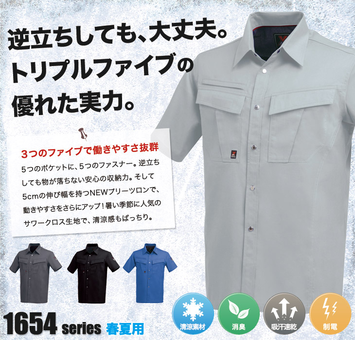 1654シリーズ,ジーベック,春夏用,半袖シャツ,清涼,帯電防止,制電,吸汗速乾,消臭,シルバーグレー,ブルー,チャコールグレー,黒,ブラック,