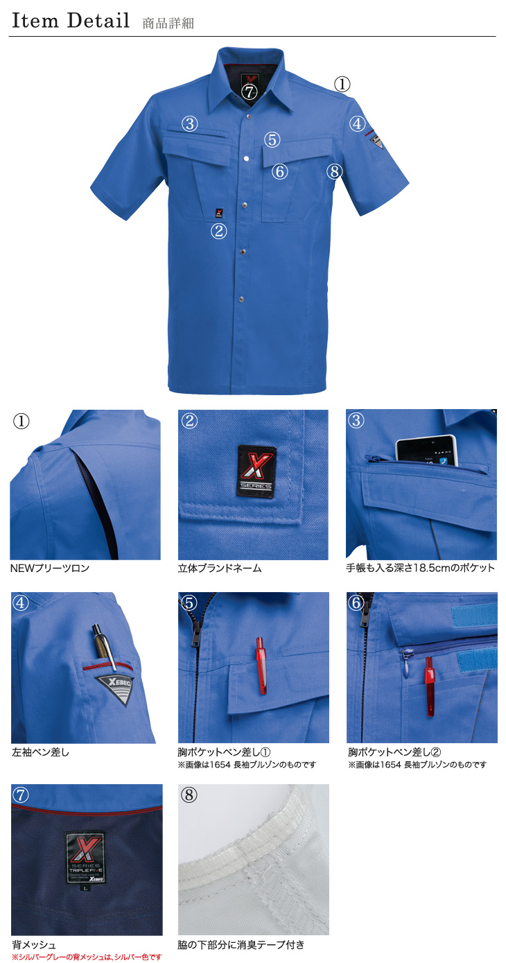 1654シリーズ,ジーベック,春夏用,半袖シャツ,清涼,帯電防止,制電,吸汗速乾,消臭,シルバーグレー,ブルー,チャコールグレー,黒,ブラック,