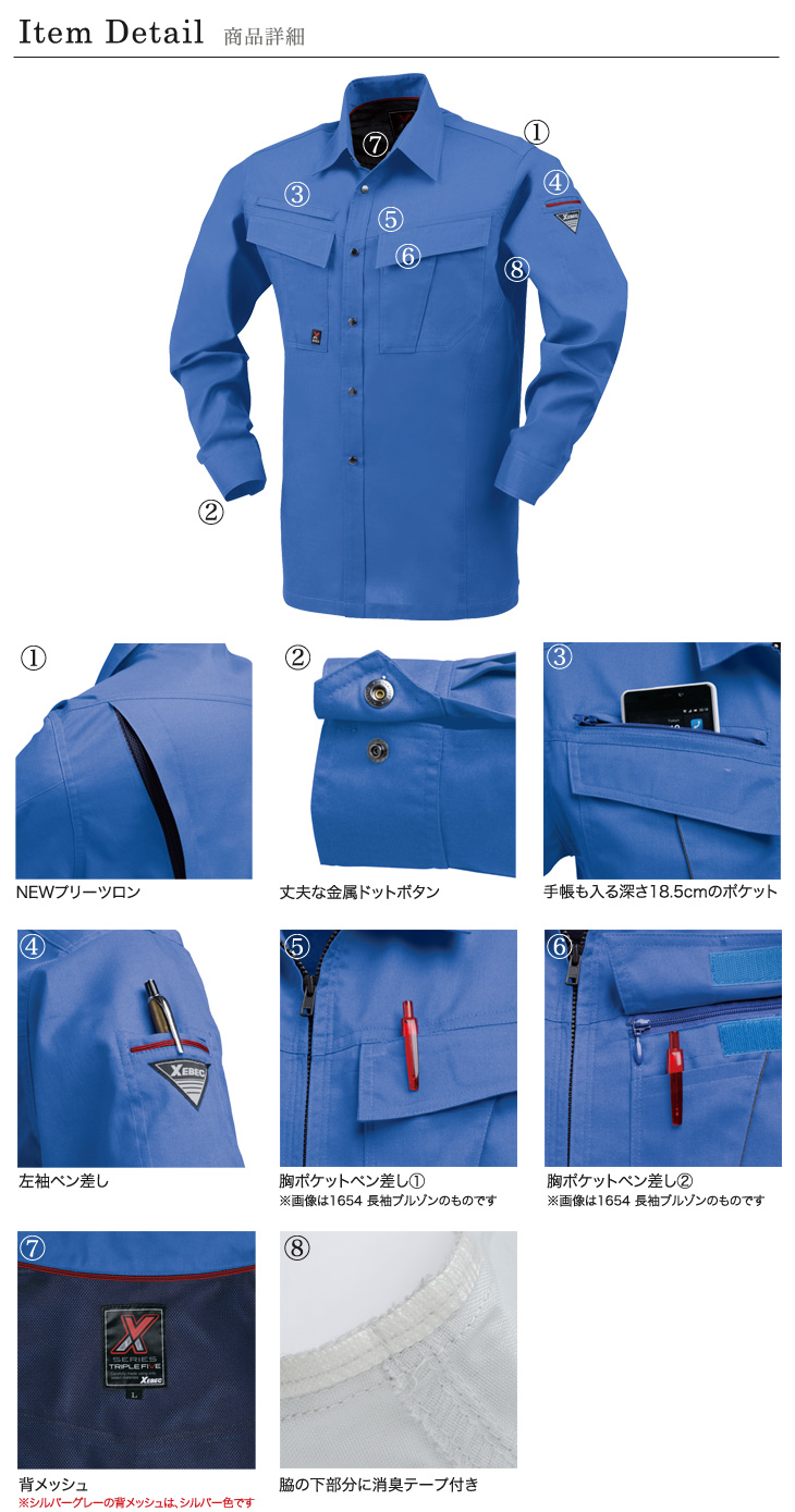 1654シリーズ,ジーベック,春夏用,長袖シャツ,清涼,帯電防止,制電,吸汗速乾,消臭,シルバーグレー,ブルー,チャコールグレー,黒,ブラック,
