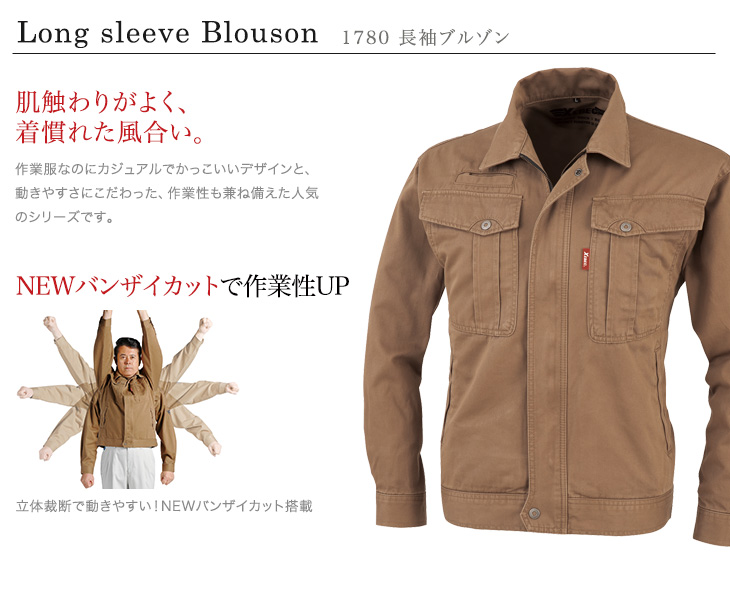 かっこいい,1780,長袖ブルゾン,ジーベック,秋冬用,1780シリーズ,KAKUDAモデル,綿100%,ソフト,洗い加工,アイボリー,モカ,ストーンブラック,鉄鋼,機械,建設,建築