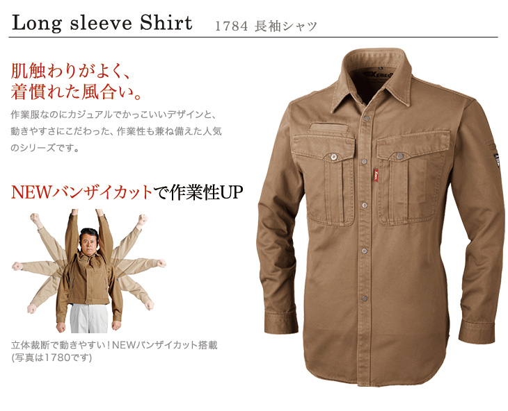 かっこいい,1780,長袖シャツ,ジーベック,秋冬用,1780シリーズ,KAKUDAモデル,綿100%,ソフト,洗い加工,アイボリー,モカ,ストーンブラック,鉄鋼,機械,建設,建築