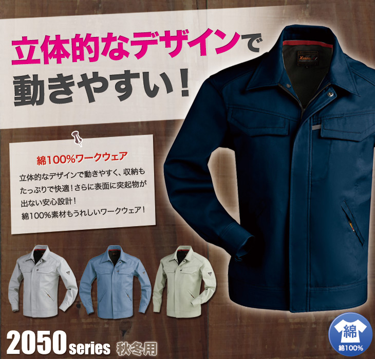 作早2015AW,2050シリーズ,ジーベック,秋冬,長袖ブルゾン,綿100%,鉄鋼,機械,溶接,激安,コン,ネービー,グレー,ブルーグレー,モスグリーン,バンザイカット,安心設計,大工,農作業着,農業