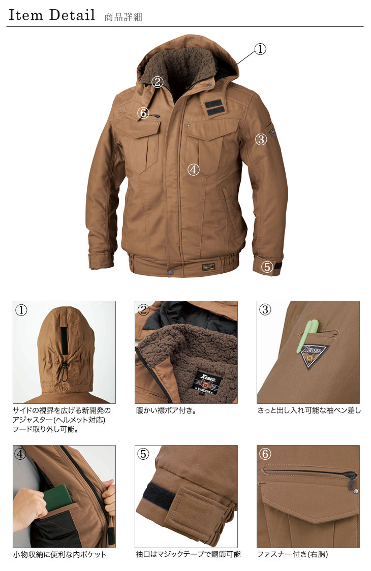 ジーベック,防寒服,防寒,ブルゾン,ジャンパー,ブラック,カーキ,モカ,ボア,アジャスターフード,綿100