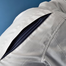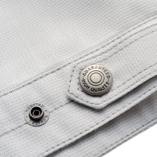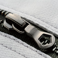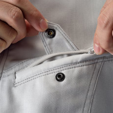 デザインアクセントでもある右胸ポケットのファスナーは金属製