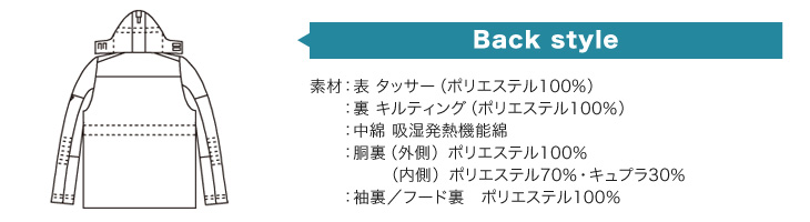 - 表:タッサー(ポリ100%)、裏:キルティング(ポリ100%)、中綿:吸湿発熱機能綿、胴裏(外):ポリ100%、(内)ポリ70%・キュプラ30%、袖・フード:ポリ100%