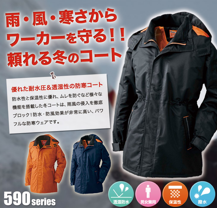 雨・風・寒さからワーカーを守る、優れた耐水性と浸透性を持った防水防寒コート。