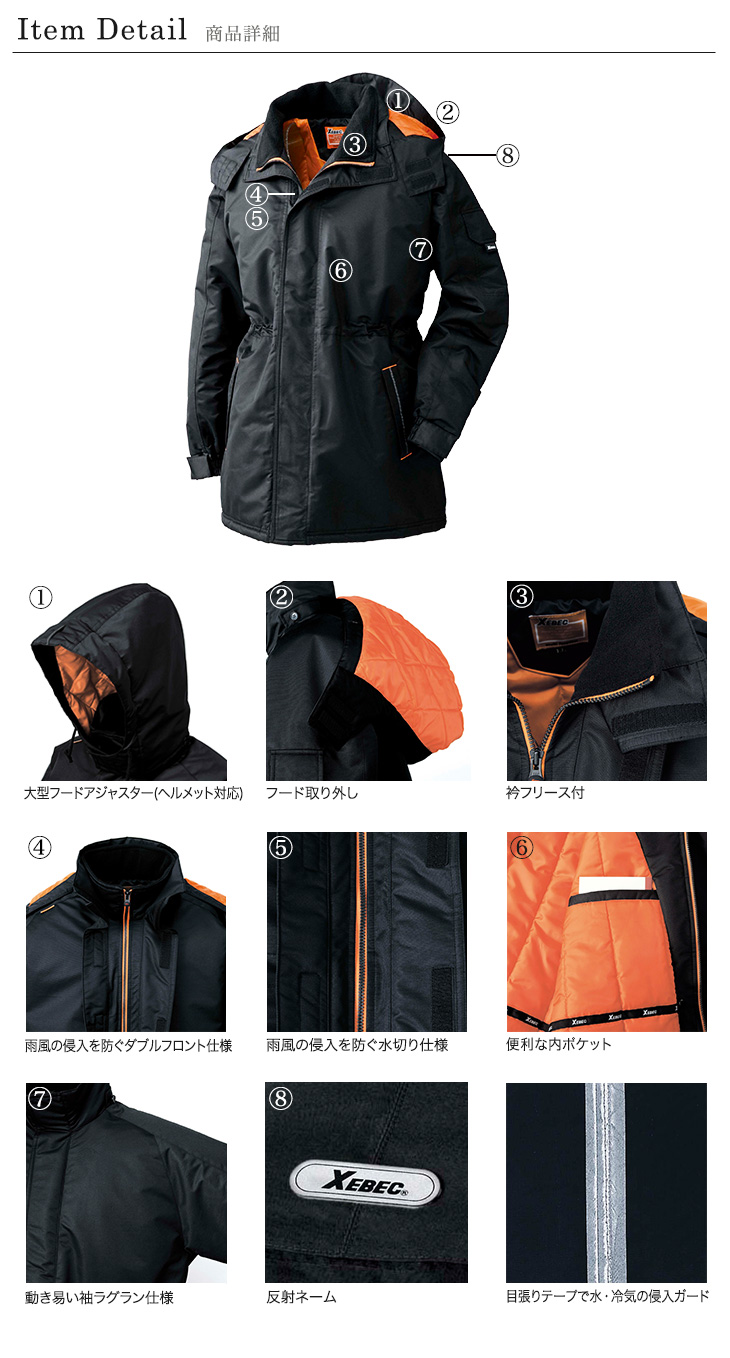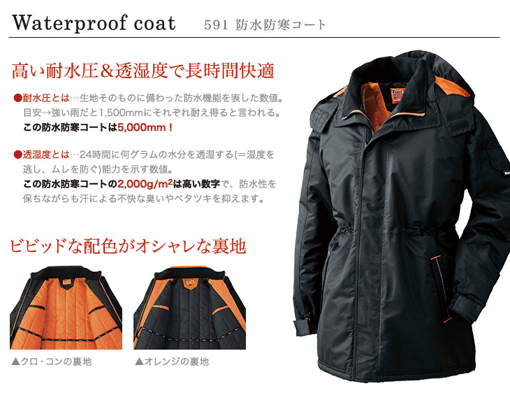 男女兼用,小さい防寒,防水防寒,防寒服,コート,ジーベック,防水性,寒冷地仕様,透湿性2000g,耐水圧5000mm,撥水加工,建設,建築,土木,鉄工,機械,電気,設備,オレンジ