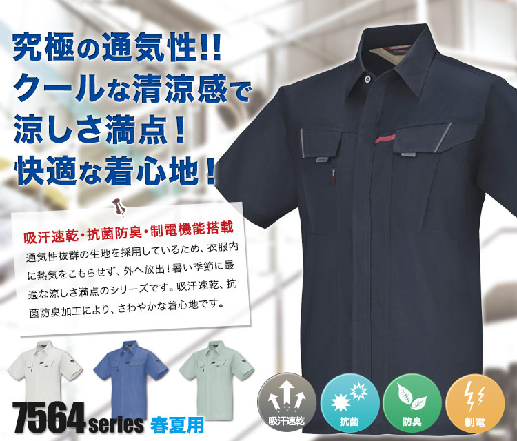 半袖シャツ,ジーベック,春夏用,7560シリーズ,ジーベックファンクション,コン,シルバーグレー,ブルー,モスグリーン,サワークロス,メッシュプリーツロン,帯電防止,通気性,吸汗性,速乾性,抗菌防臭,バンザイカット,建設,建築,運送,倉庫,電機,設備