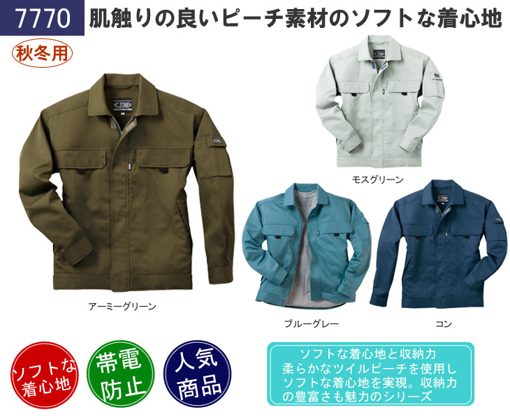 作早2015AW,長袖ブルゾン,ジーベック,秋冬用,7770シリーズ,C.ZONE,帯電防止,ソフト起毛,コン,ネービー,ブルーグレー,モスグリーン,アーミーグリーン,クロスゾーン,建設,土木,電気,設備,農業,運送,倉庫,