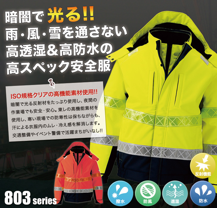 ジーベック,803シリーズ,防寒服,長袖,ブルゾン,防水,防風,撥水,透湿,オレンジ,イエロー,反射