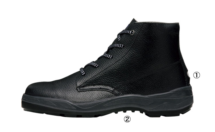 - 規格:JIS T-8101 CⅠ/S/P1・革製S種〈普通作業用〉クリート付き表底、表底の耐燃料油性、かかと部の衝撃エネルギー吸収性、製法:インジェクション製法、先芯:樹脂先芯、甲被:牛革(型押ソフト)、靴底:ウレタン2種、ウィズ:EEE、重量(g/両足):900g(26.0cm)
