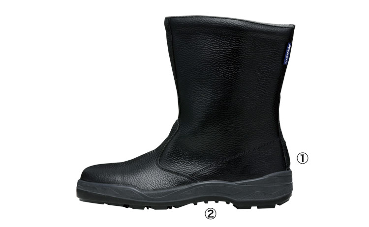 - 規格:JIS T-8101 CⅠ/S/P1・革製S種〈普通作業用〉クリート付き表底、表底の耐燃料油性、かかと部の衝撃エネルギー吸収性、製法:インジェクション製法、先芯:樹脂先芯、甲被:牛革(型押ソフト)、靴底:ウレタン2種、ウィズ:EEE、重量(g/両足):1000g(26.0cm)