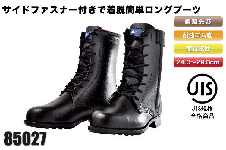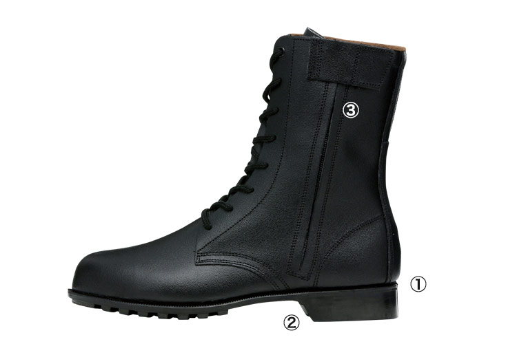 サイドファスナーがついて着脱が簡単な編上げタイプの安全長靴。牛革使用&鋼製先芯入りで、耐熱性の高いゴム一層底で鉄工所や溶接などにも対応しています。