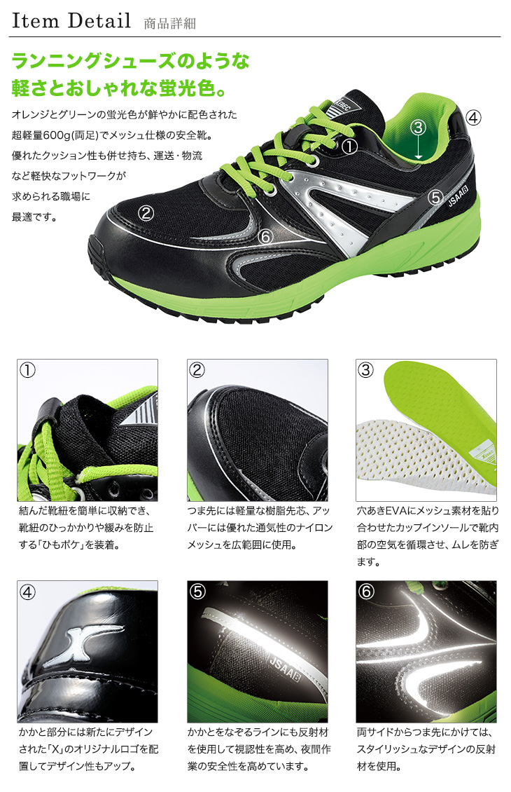 蛍光色が鮮やかに配置されたおしゃれで軽い安全靴。