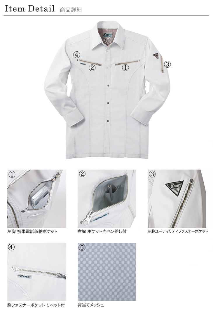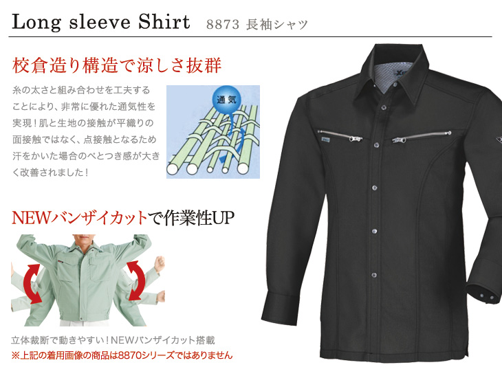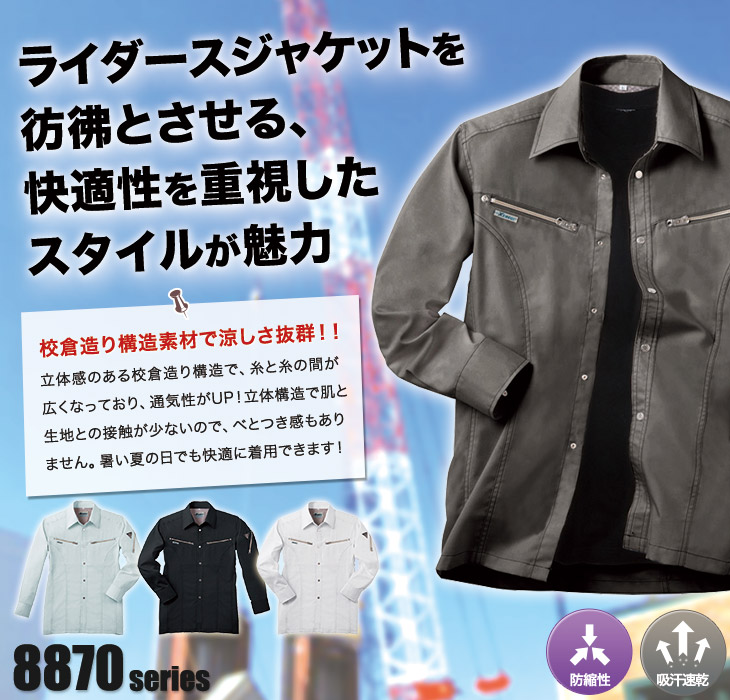 8860,おしゃれ,長袖シャツ,ジーベック,春夏用,角田,KAKUDA,Kakuda,8870シリーズ,新商品,通気性,吸汗性,速乾性,清涼,イージーケア,防縮防シワ,プリーツロン,ピタリティ,バンザイカット,シルバーグレー,クロ,黒,かっこいい,5L,建設,建築,営業,配達,運送,倉庫