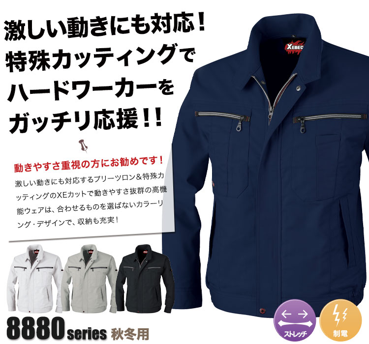 8880,かっこいい,大きい,プリーツロン,帯電防止,長袖ブルゾン,コン,ネービー,シルバーグレー,モスグリーン,クロ,XE,秋冬,製品制電,ストレッチ,5L,建設,建築,電気,設備,運送,倉庫,営業