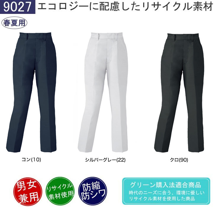 スラックス,パンツ,ジーベック,春夏用,9020シリーズ,ワーキング&サービスウエア,リサイクル素材,帯電防止,清涼,イージーケア,速乾性,防縮防シワ,男女兼用,ペア,ポリ高混,コン,シルバーグレー,ブルー,サックス,エメラルドグリーン,レッド,クロ,5L,グリーン購入法,透け防止,脇ゴム,イベント,営業,配達,ビルメン,清掃,イベント,運送,倉庫