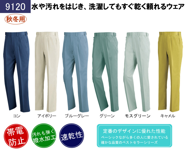 作早2015AW,スラックス,9100シリーズ,JIS秋冬,帯電防止,JIS規格,パンツ,コン,ネービー,アイボリー,ブルーグレー,グリーン,モスグリーン,キャメル,XE,秋冬,製品制電,撥水加工,速乾性,建築,建設,鉄鋼,機械,運送,倉庫