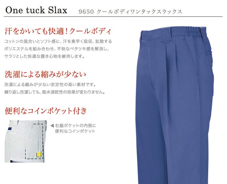 スラックス,パンツ,ジーベック,春夏用,9650シリーズ,クールビズ,クールボディ,プリーツロン,XEカット,スムーズアップ,吸汗速乾,清涼,消臭,イージーケア,防縮防シワ,クールグレー,クールブルー,クールグリーン,5L,建築,機械,電気,農作業,運送,営業