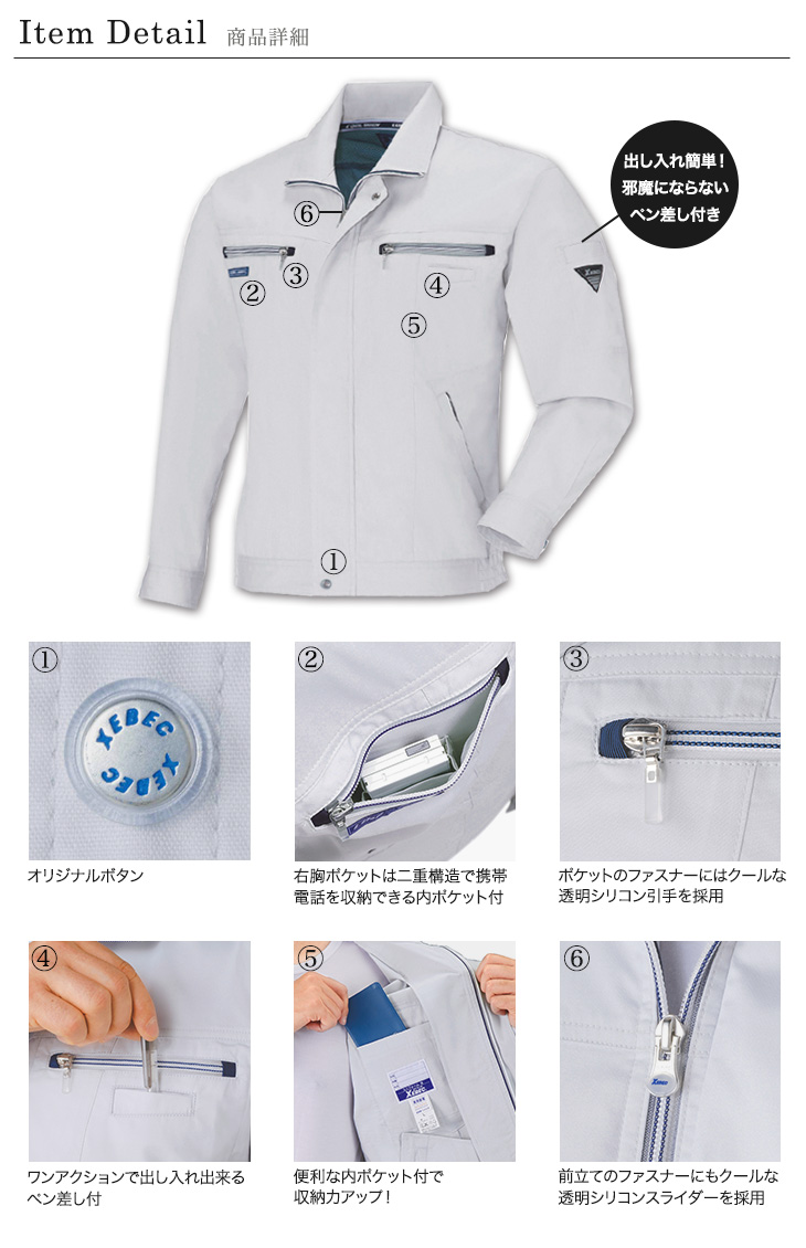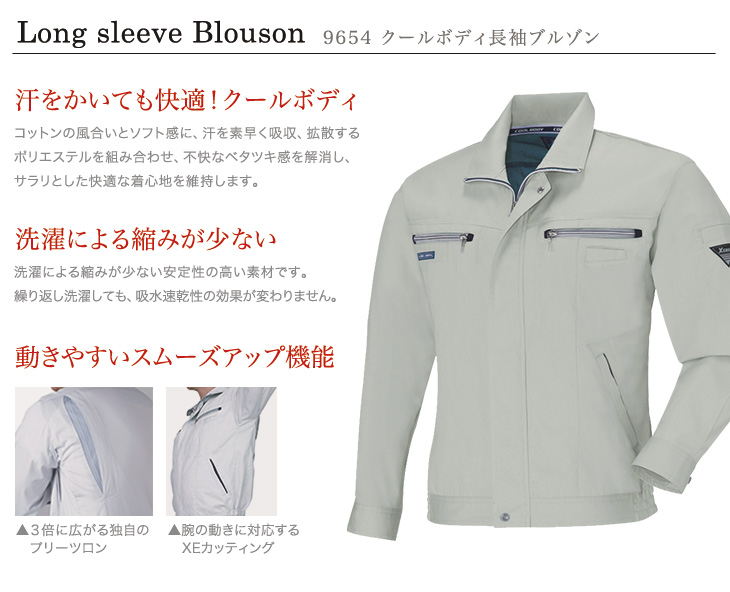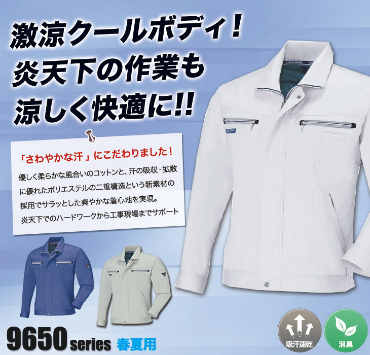 長袖ブルゾン,ジーベック,春夏用,9650シリーズ,クールビズ,クールボディ,プリーツロン,XEカット,スムーズアップ,吸汗速乾,清涼,消臭,イージーケア,防縮防シワ,クールグレー,クールブルー,クールグリーン,5L,建築,機械,電気,農作業,運送,営業