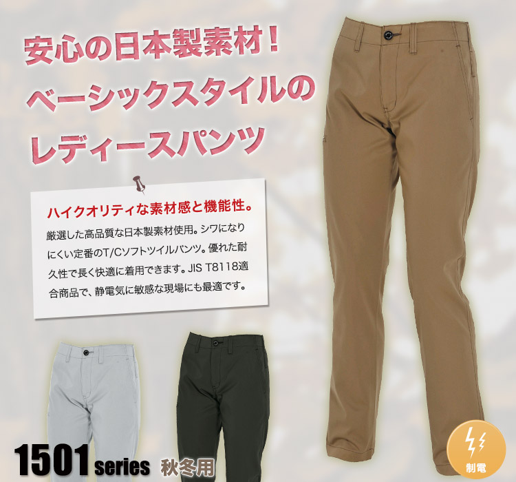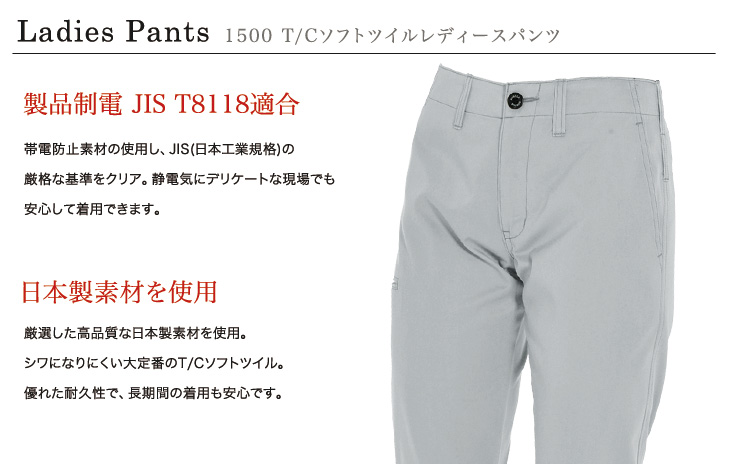 安心な日本製素材のレディースパンツ。制電対応素材を使用しているので静電気にデリケートな現場でもお使いいただけます。