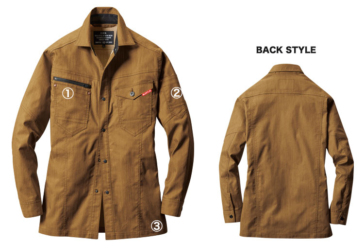 カジュアル過ぎないバートルの長袖シャツ。ムラ感のある糸を使用し、劣化しにくくストレッチが程よく効き、永くご愛用いただけるかっこいい作業服です。