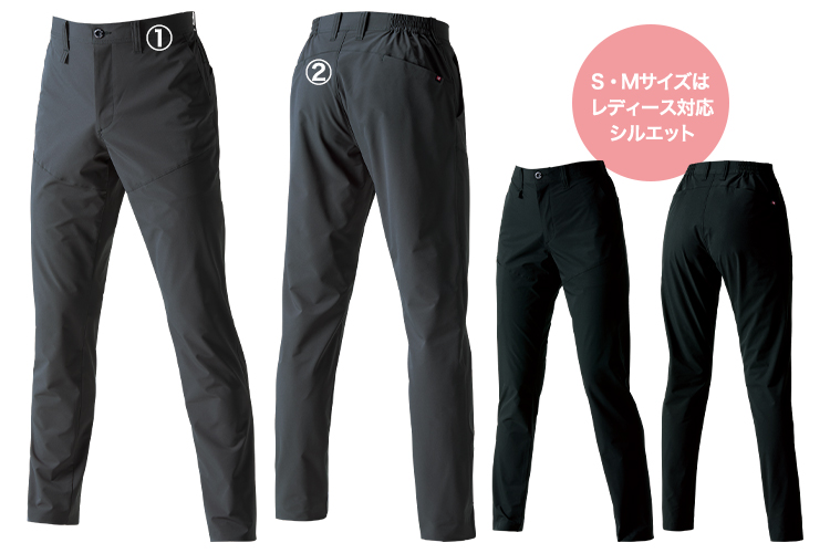 従来のポリエステルにはなかった柔らかい肌触りやストレッチ性が特徴の植物由来バイオマス合成繊維「SOLOTEX®」を使用。スポーティですっきりとしたテーパードシルエットが魅力のSDGs対応パンツです。