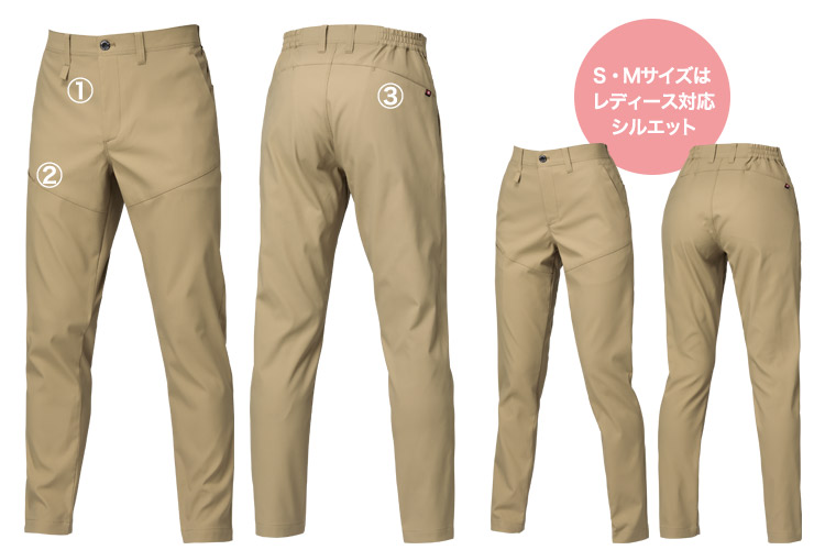 ポリエステル100%なのにマットな質感とソフトな肌触りが特徴の植物由来の合成繊維「エコディア®」を採用。スポーティですっきりとしたテーパードシルエットが魅力のSDGs対応ワークパンツです。