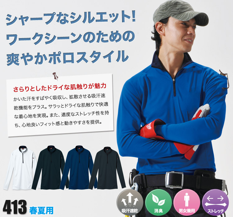 [通年]バートル 413 ドライメッシュ長袖ジップシャツ[左袖ポケット付][男女兼用](03-413)