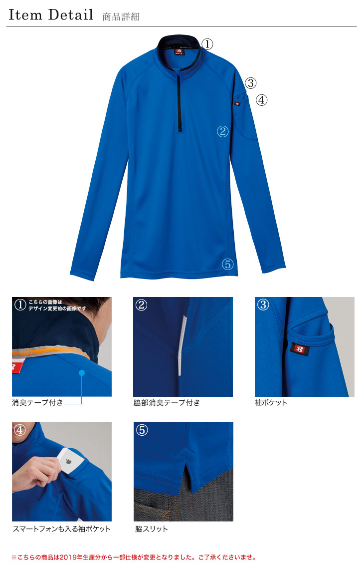 前立てファスナーがかっこいいスポーティーなデザイン。汗のベタつきを抑える吸汗速乾加工つきのバートル長袖ジップシャツ。