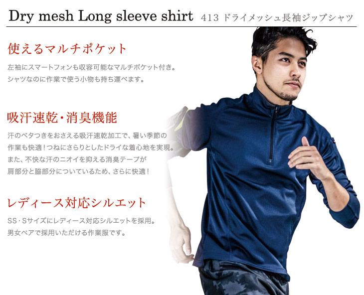 [通年]バートル 413 ドライメッシュ長袖ジップシャツ[左袖ポケット付][男女兼用](03-413)